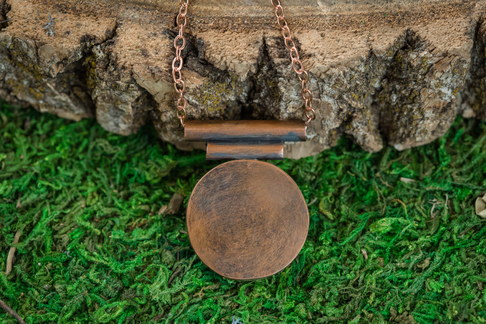 Escape inside this Realm full of wondrous life. Light blue preserved moss is captured inside this glass dome and set in fine silver on top of oxidized copper. Two copper tubes hold the copper chain that is approximately 18″ with a handcrafted clasp.