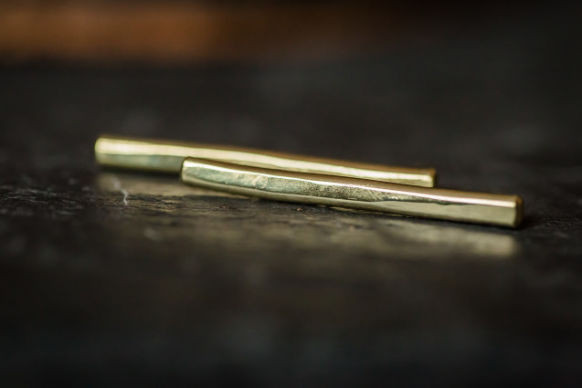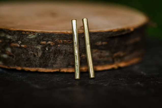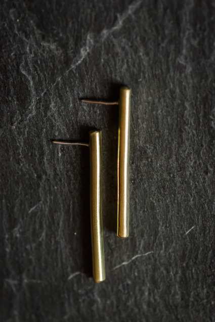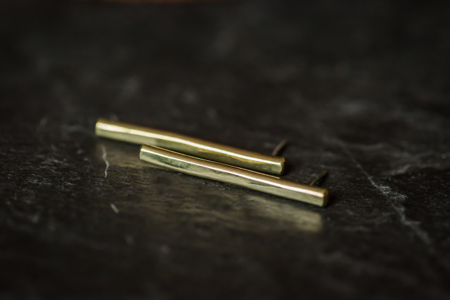 These shiny, simple and elegant hammered brass earrings dangle lightly from the earlobes. Posts are sterling silver.