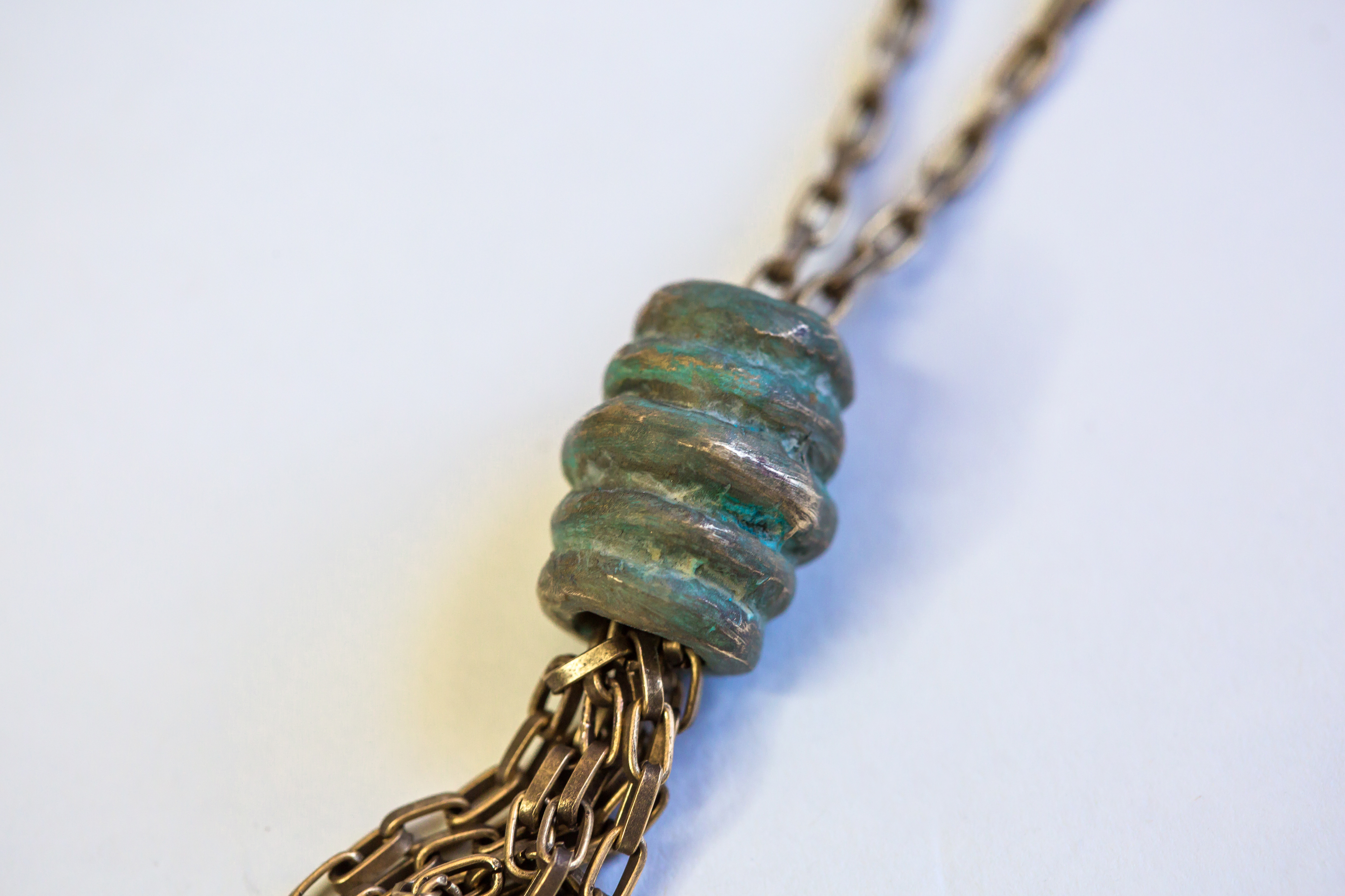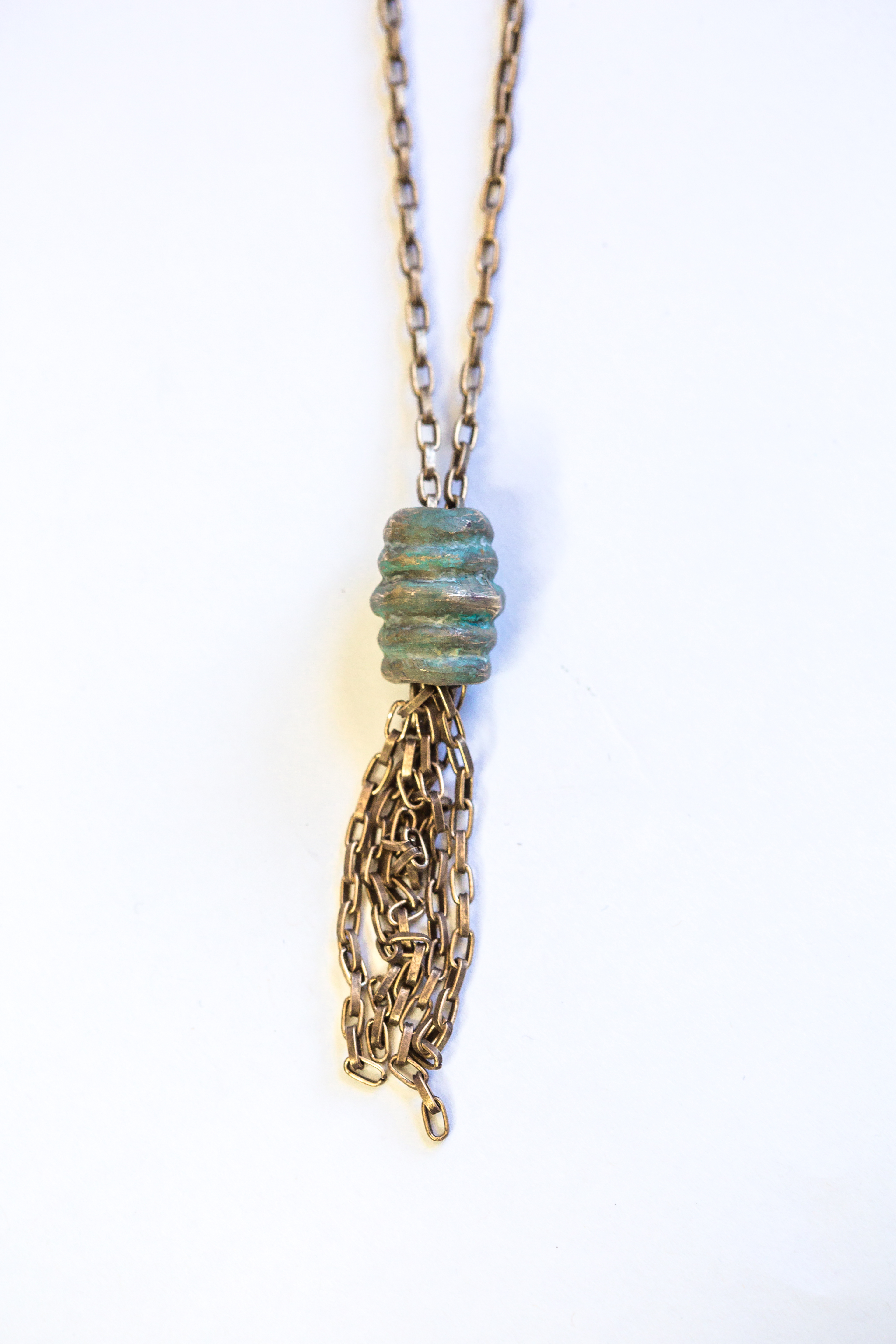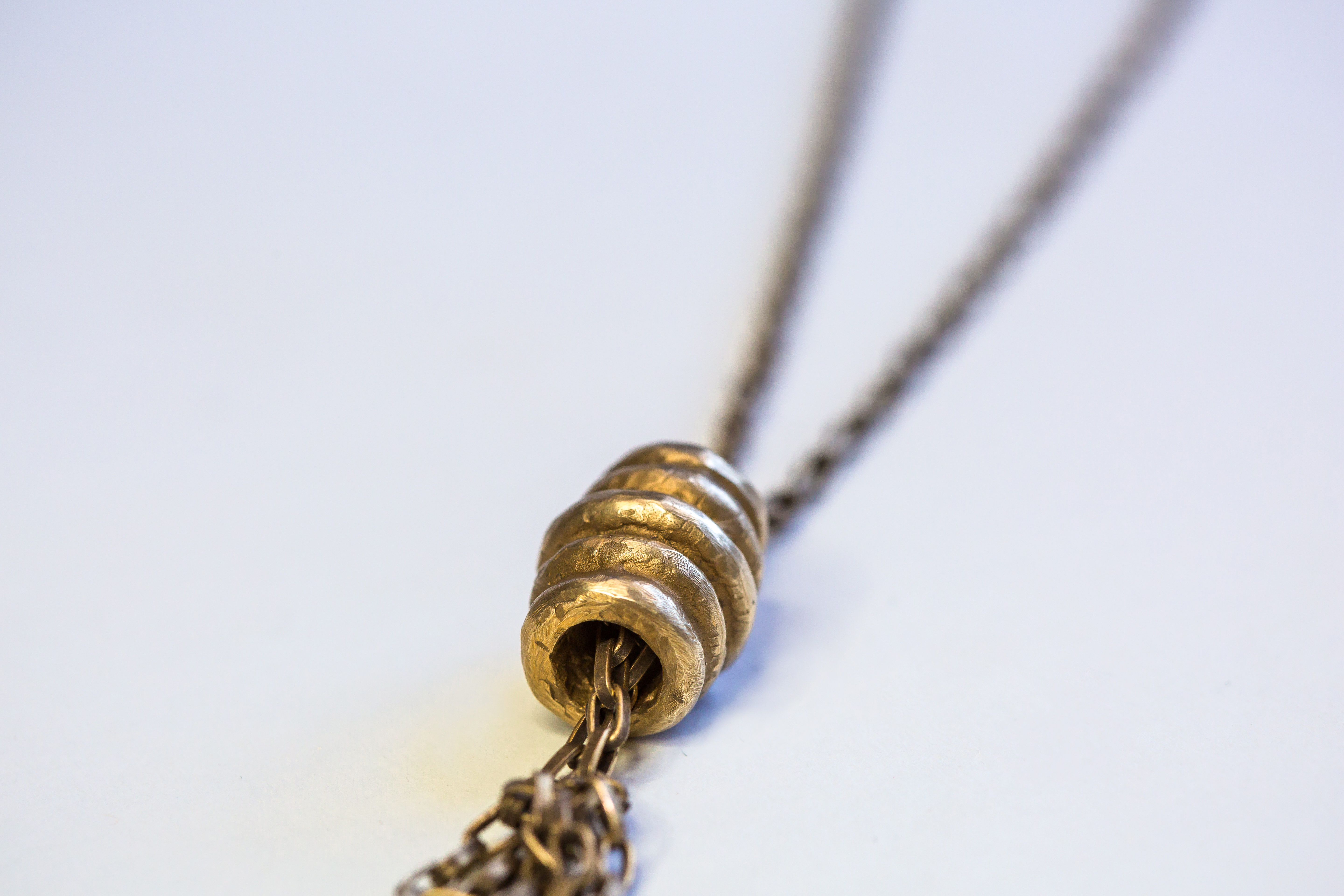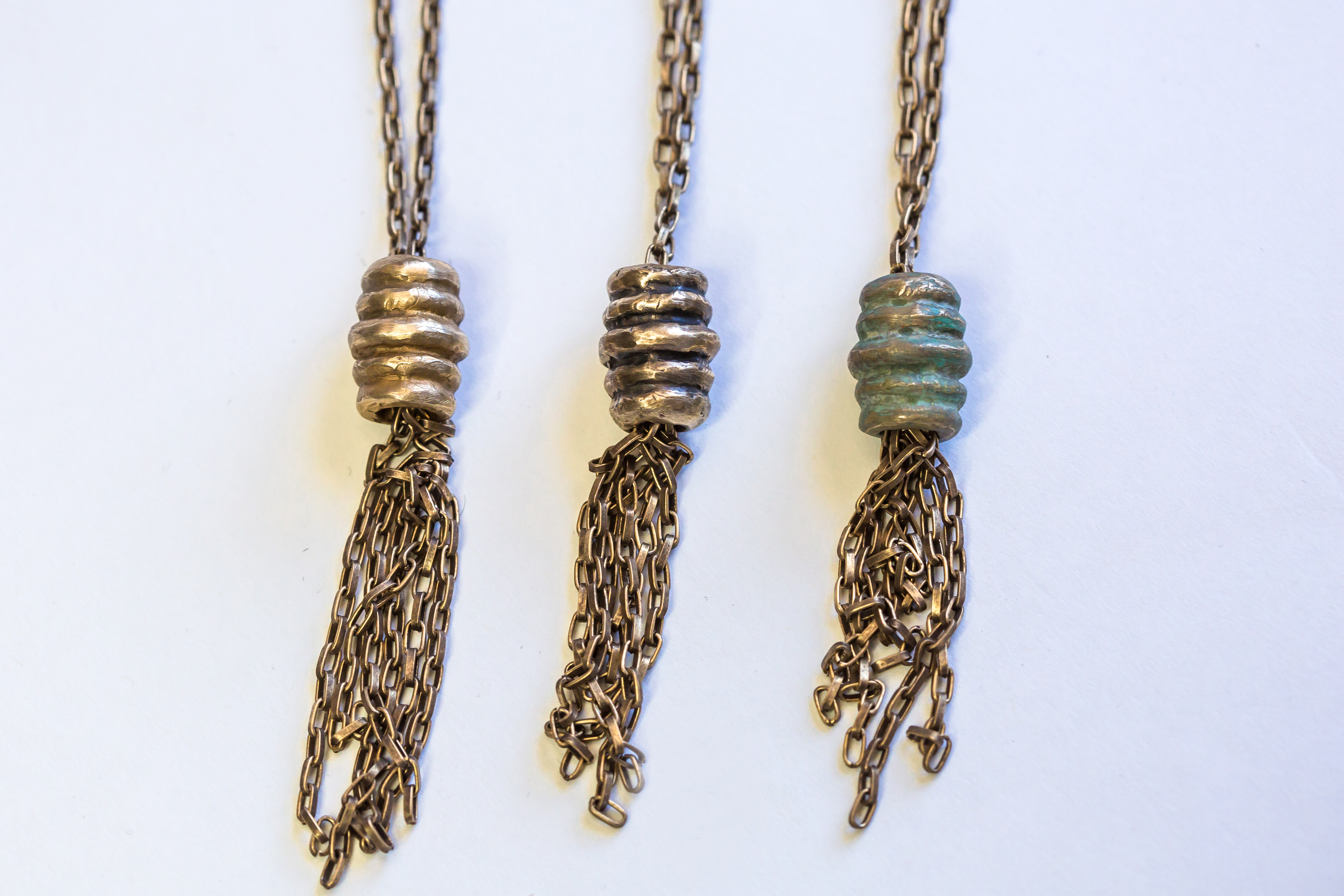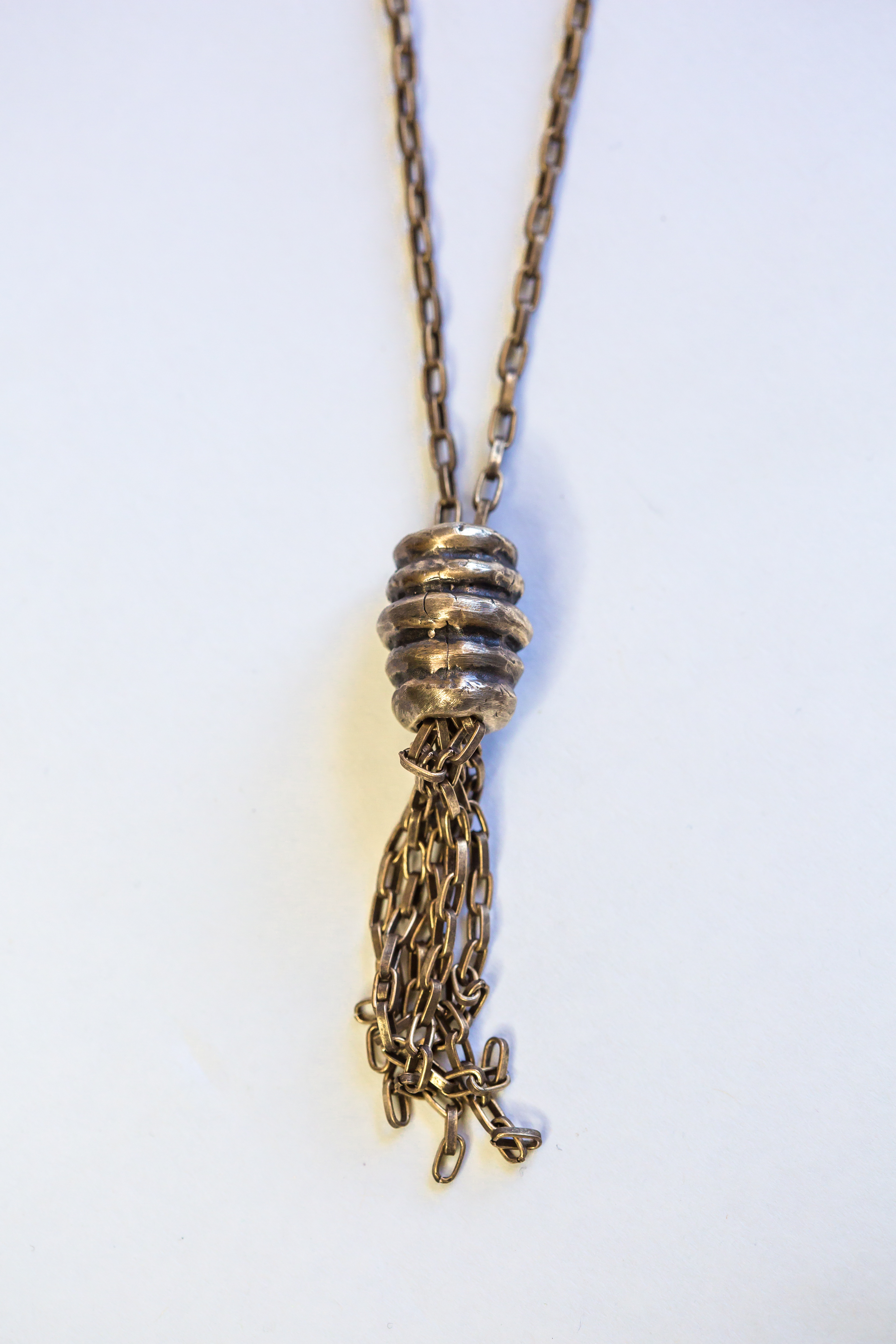 The Bronze Honey Dipper necklace has a bronze honey dipper piece strung onto a 28″ antiqued bronze chain. The honey dipper piece was carved by hand in wax and casted in bronze. Fringe hangs freely underneath the honey dipper to portray honey. Available in three different finishes: polished, antiqued and blue oxidized patina (please see pictures for variances).