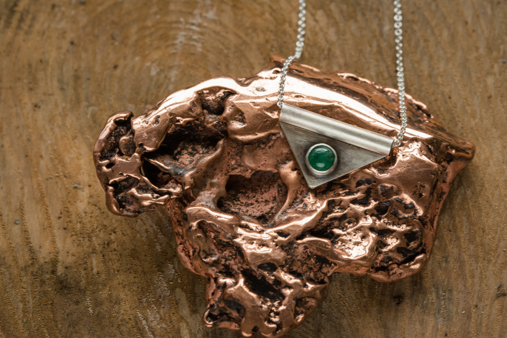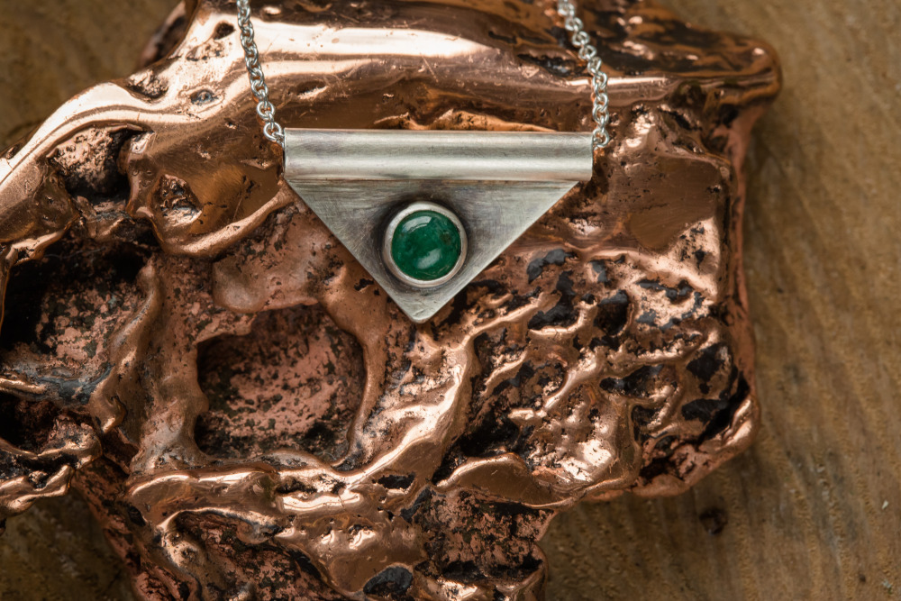 Wander in Emerald City while wearing this elegant piece. The deep green stone is an emerald from my favorite rock shop in Evanston. Set in all oxidized sterling silver to highlight the true deep green beauty this stone holds. Chain is approximately 16″ oxidized sterling silver with handcrafted clasp.