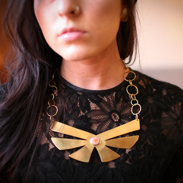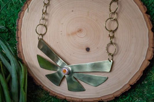 One of a kind! Sweet yet funky modern butterfly necklace with a Mexican Fire Opal in the center. Loopy Brass chain made with various sized & textured rings for a complete hand-crafted piece, from start to finish.