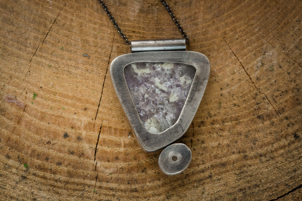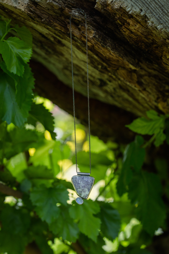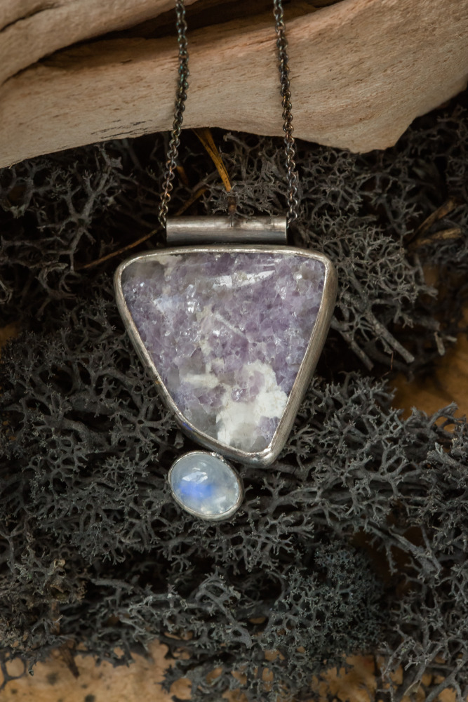 The pairing of these stones makes me believe that they were made for one another. The moonstone glows brightly next to its’ Lepidilite speckled stone friend, both sitting pretty side by side. Chain is approximately 24” with a handcrafted clasp.