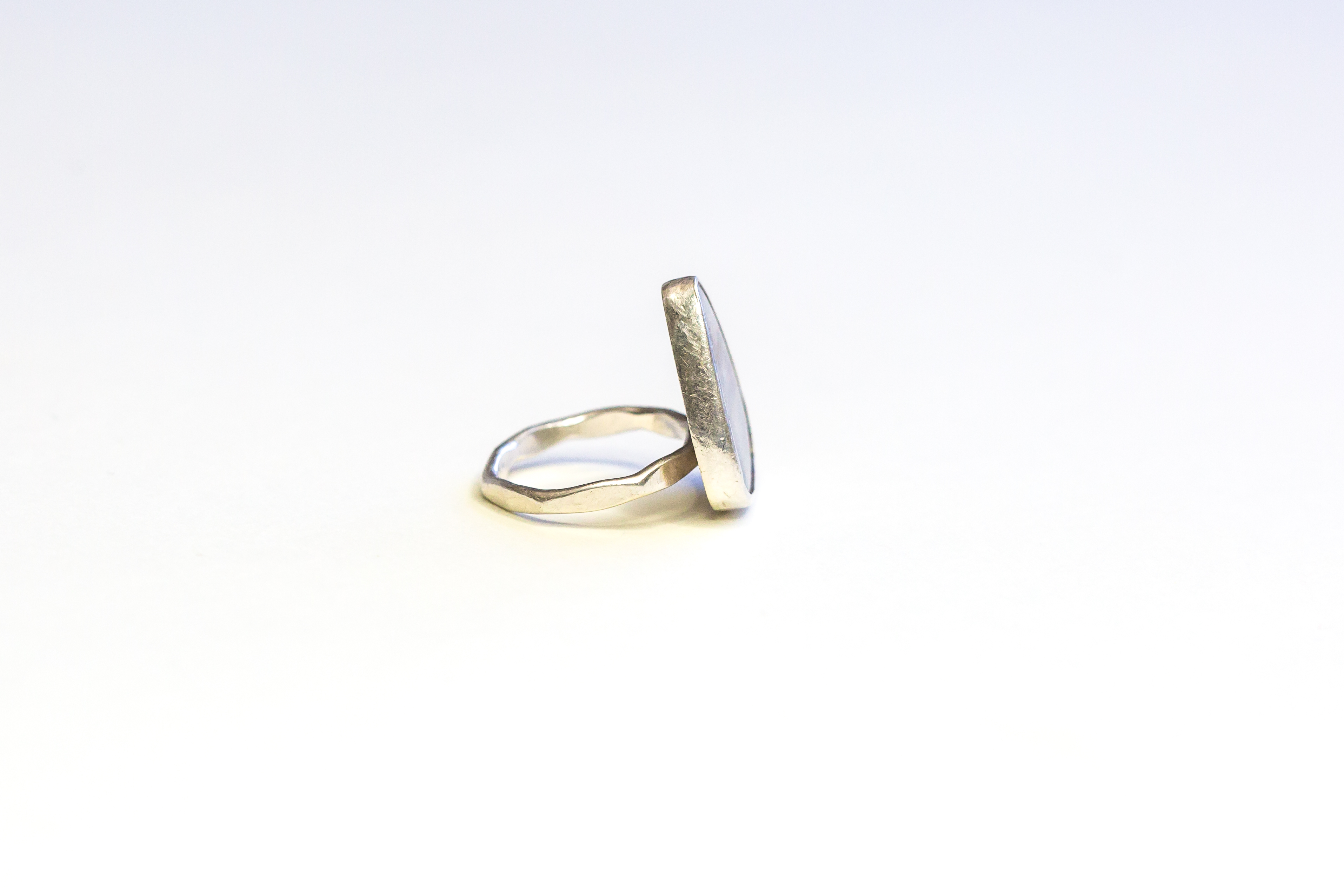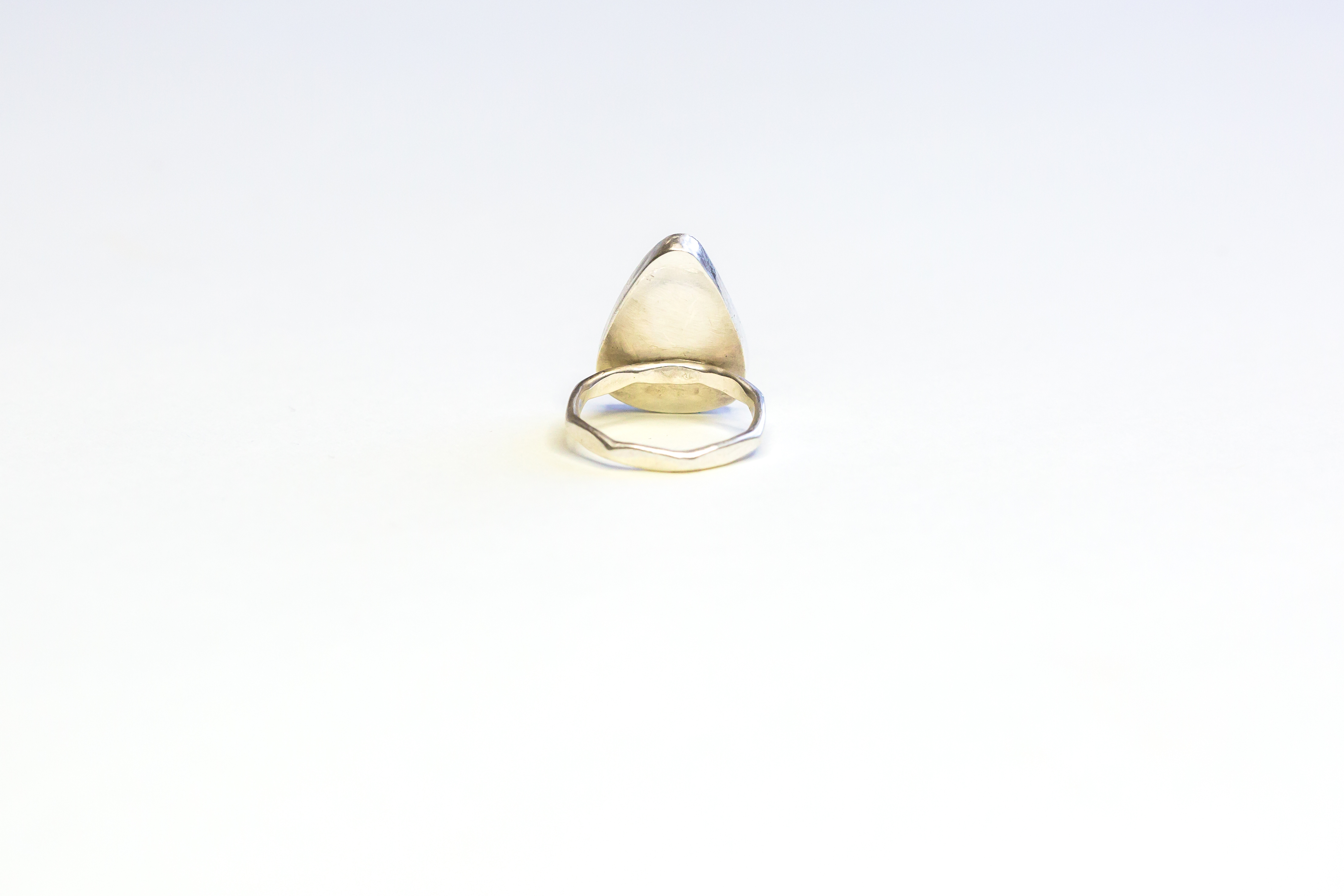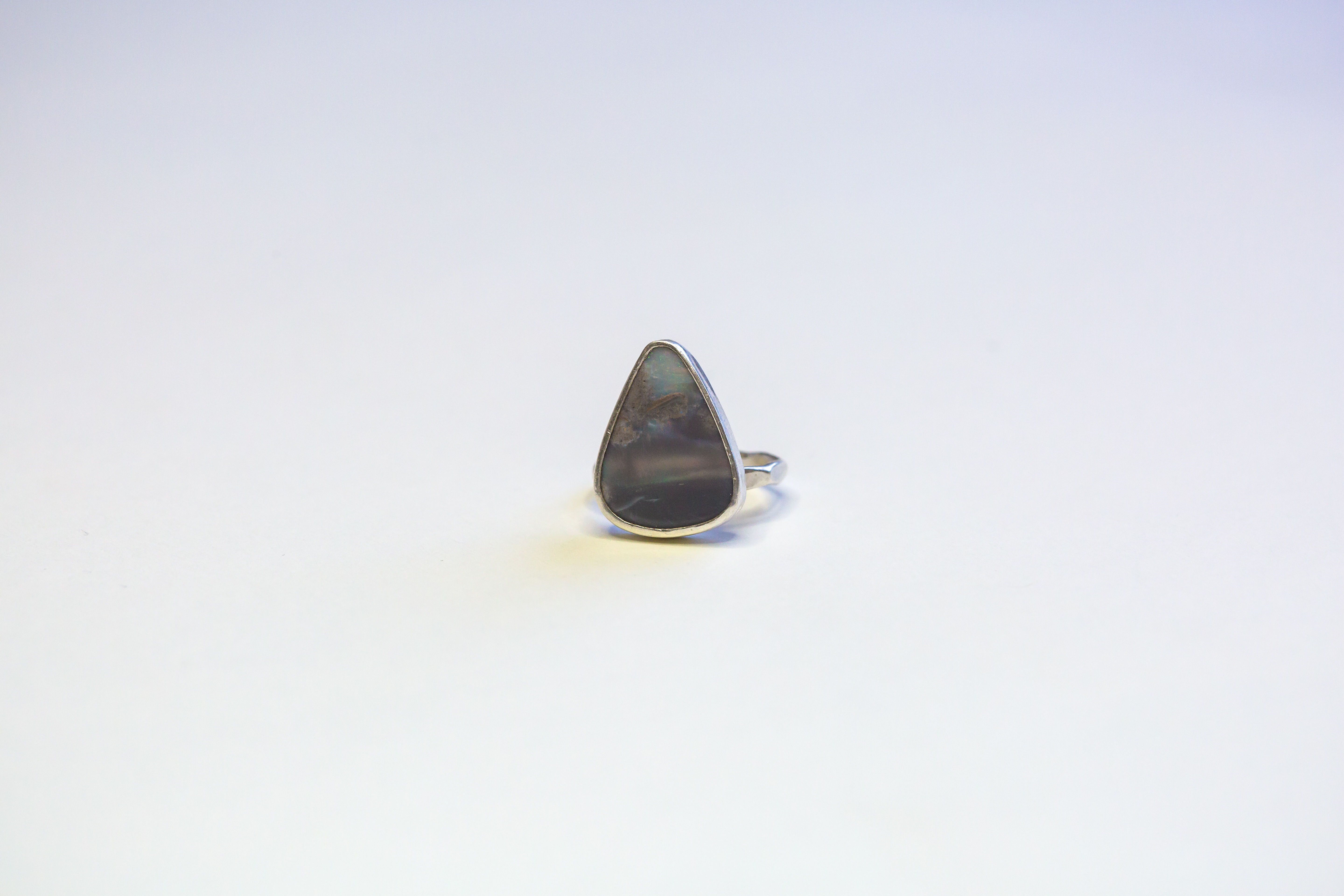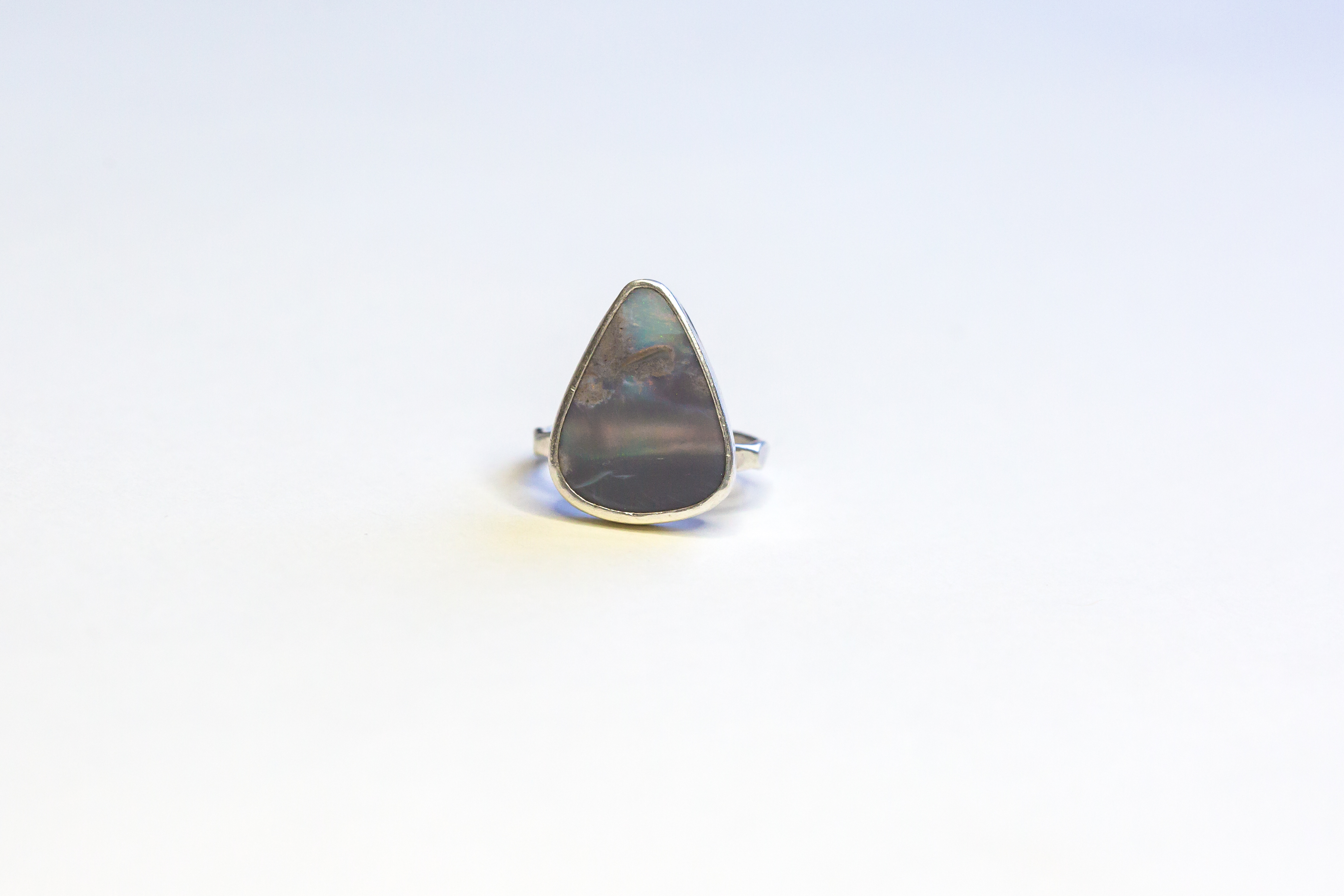 Unique and one-of-a-kind Australian opal set in fine and sterling silver. Ring band is solid sterling silver and hammered all the way around. Flashes of pink and green sparkle in the light. One of Carlee’s favorite stones she purchased at the Tucson Gem Show in February 2016.