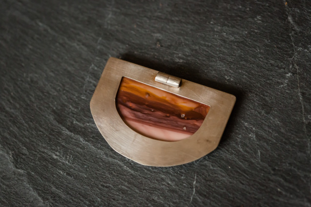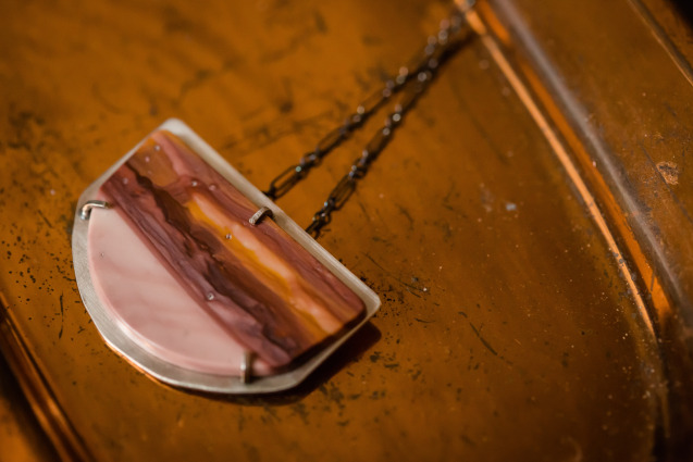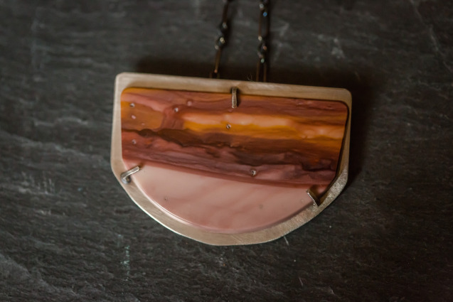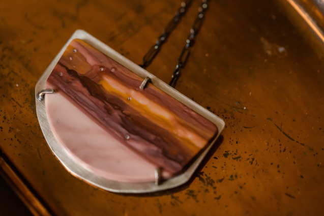 Mariposa Jasper stone set in a modern sterling silver prong setting. Chain is 29″ oxidized sterling silver with handcrafted clasp. Cutout design is sawed by hand for extra detail.